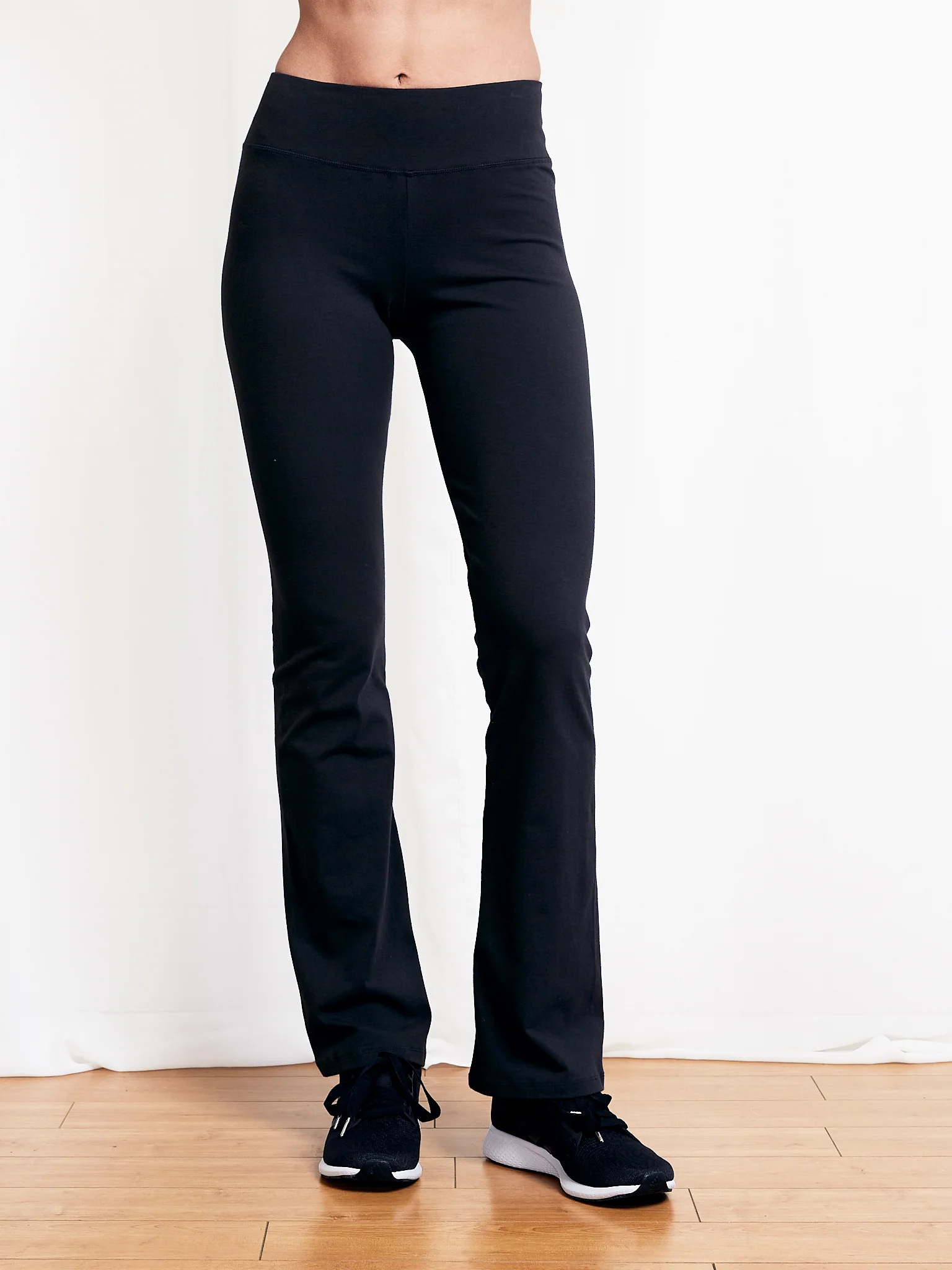 This is a fabulous active or street wear pant. The organic cotton fabric breathes to keep you cool and comfortable. The spandex stretch lets you move and prevents bagging. It has a modern shape with just a slight bell and a secure, non-binding wide fabric waistband.
