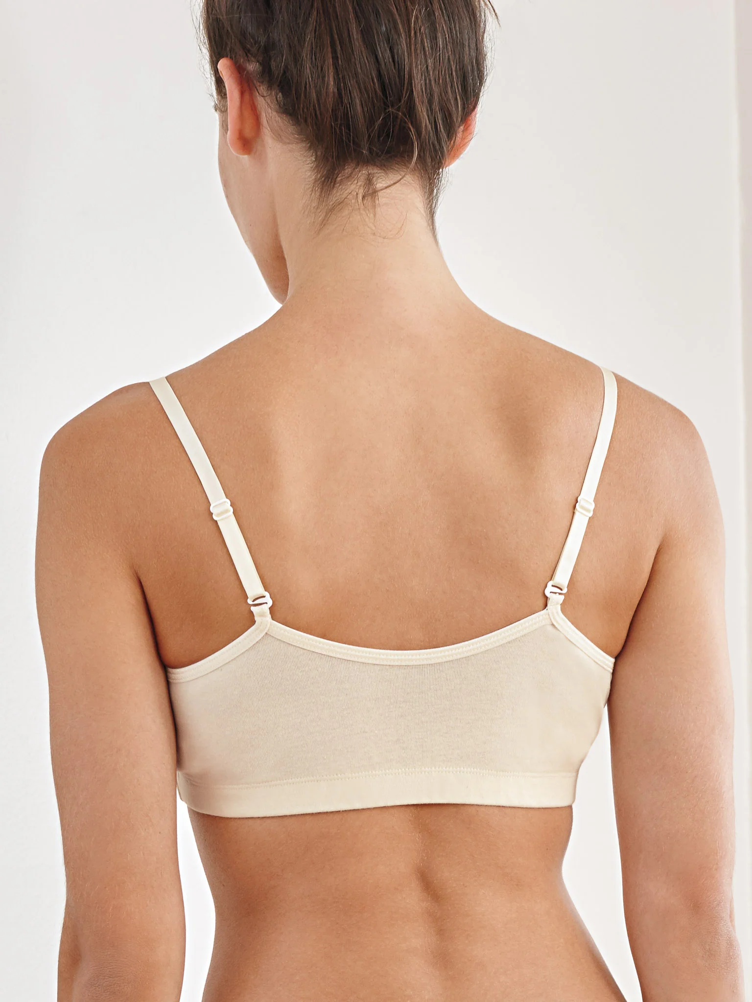 Finally, an all cotton, organic bra with adjustable straps and an option soft cup for added support and coverage. Modeled after our very best-selling bamboo version. The straps and edging are non-latex nylon elastic.